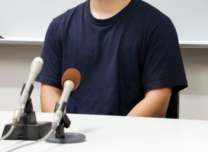 記者会見する私立関西高の元野球部員=16日午後、岡山市北区