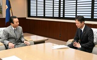 リニア中央新幹線の工事に関し協議する、静岡県の鈴木康友知事(左)とJR東海の丹羽俊介社長=20日午前、静岡県庁