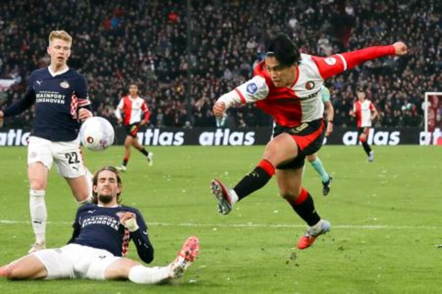 PSVアイントホーフェン戦でプレーするフェイエノールトの上田(右)=ロッテルダム(共同)
