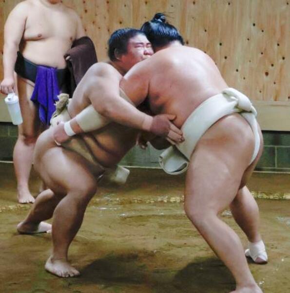 稽古をする伯桜鵬(左)=福岡県太宰府市