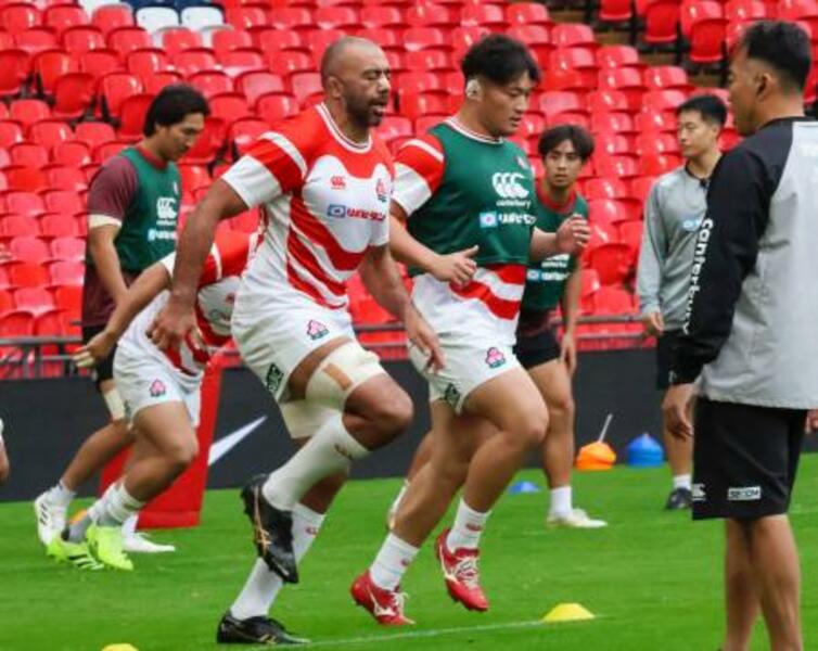 南アフリカ戦を控え、調整するラグビー日本代表のリーチ(手前左)ら=ロンドン(共同)