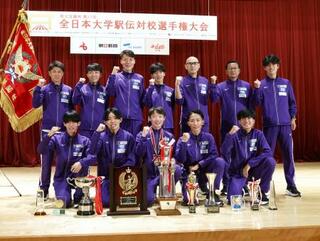 2年ぶり17度目の優勝を果たし、ポーズをとる駒大の選手ら=三重県伊勢市