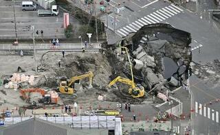 県道が陥没しトラックが転落した事故現場=2月、埼玉県八潮市
