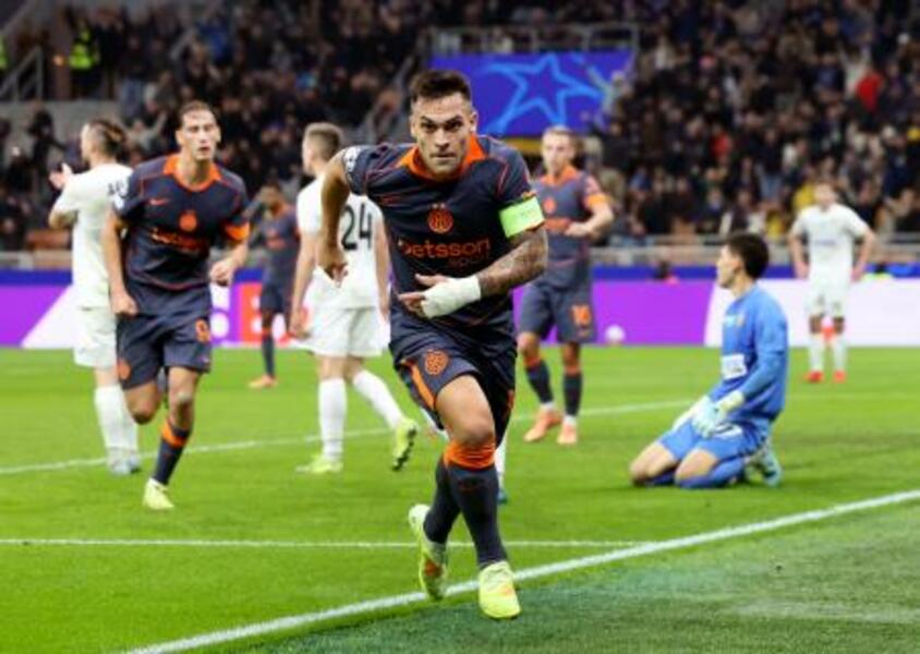 アルマトイ戦でゴールを決めたインテル・ミラノのL・マルティネス=ミラノ(ロイター=共同)