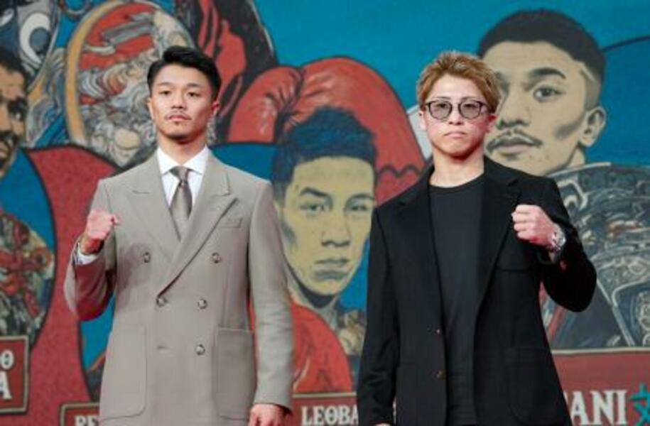記者会見を終えポーズをとる中谷潤人(左)と井上尚弥=7日、東京都中央区