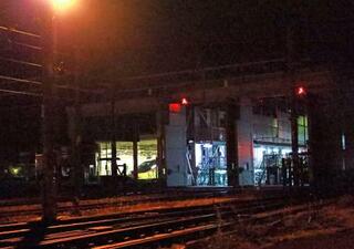 クマが入り込み、捕獲されたJR新庄駅の車庫=8日午後6時30分ごろ、山形県新庄市