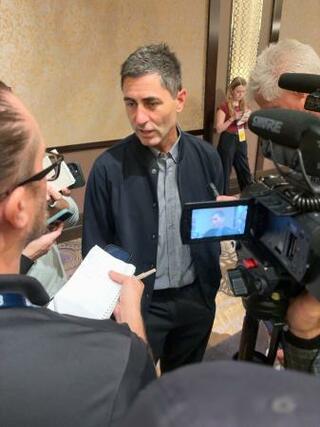 取材に応じるパドレスのプレラーGM=11日、米ラスベガス(共同)