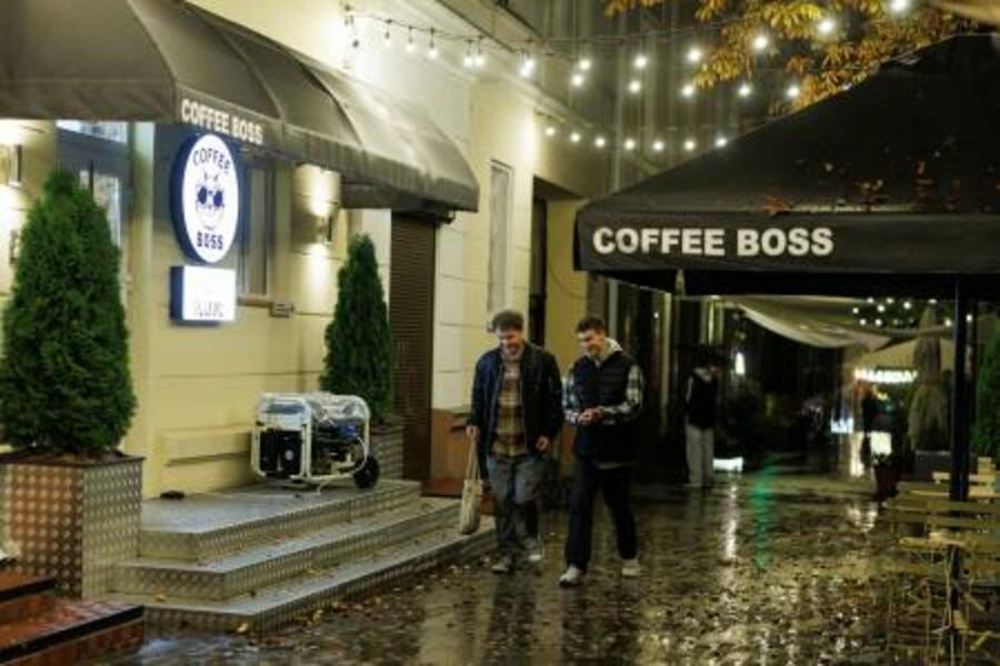 ウクライナ北部チェルニヒウで、停電中に発電機を使って営業するカフェの前を歩く若者=10月(ロイター=共同)