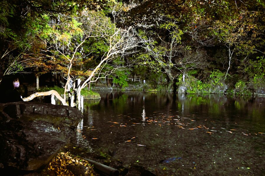 夜の水面に映る紅葉や和傘の光 小山・間々田八幡宮でライトアップ