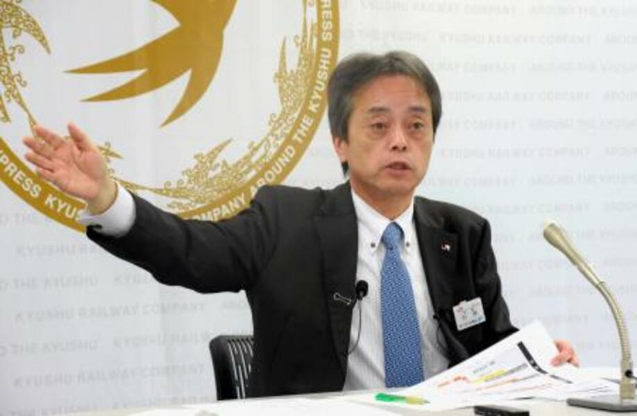 記者会見するJR九州の古宮洋二社長=27日午後、福岡市