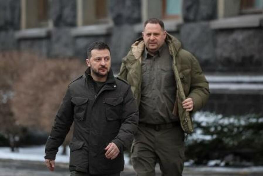 ウクライナのゼレンスキー大統領(左)とイエルマーク大統領府長官=2024年1月、キーウ(ロイター=共同)
