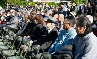 静岡県伊東市長選が告示され、候補者の演説を聞く市民ら=7日午前、伊東市