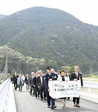 足利の中橋で南側アーチの移設工事 大型クレーンでつり上げ、市民も見守る