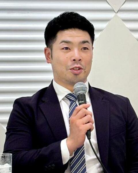 日本プロ野球選手会の新会長に就任し記者会見するソフトバンクの近藤健介=8日、大阪市