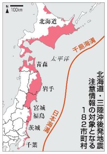 北海道・三陸沖後発地震注意情報の対象となる182市町村