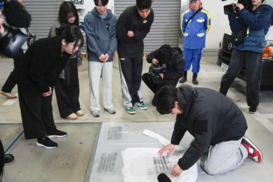 交通事故捜査を体験する学生ら=12日午後、警視庁神田署