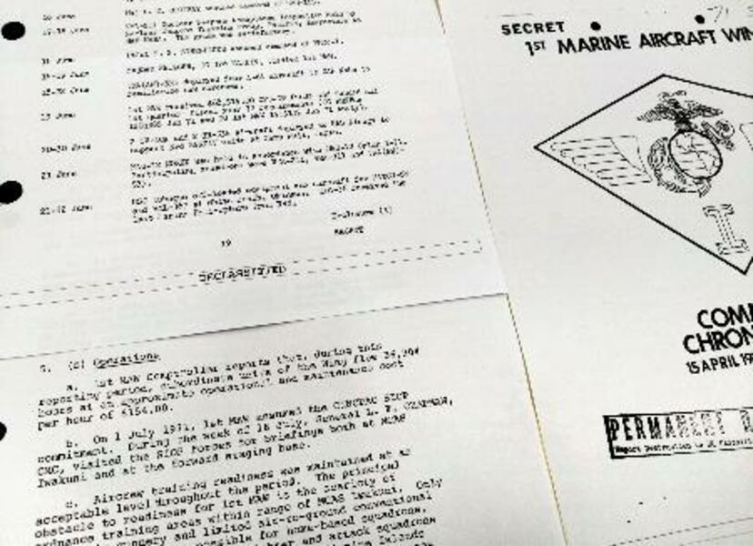 米軍岩国基地に司令部があった第1海兵航空団の記録のコピーの一部。1971年7月1日に米国の核戦争計画に組み込まれたことなどが記されている