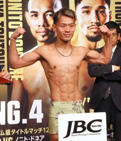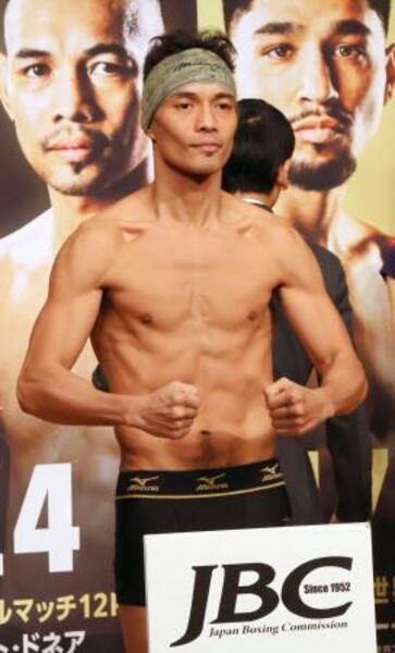 計量をパスし、ポーズを取るWBAバンタム級暫定王者のノニト・ドネア=16日、東京都内