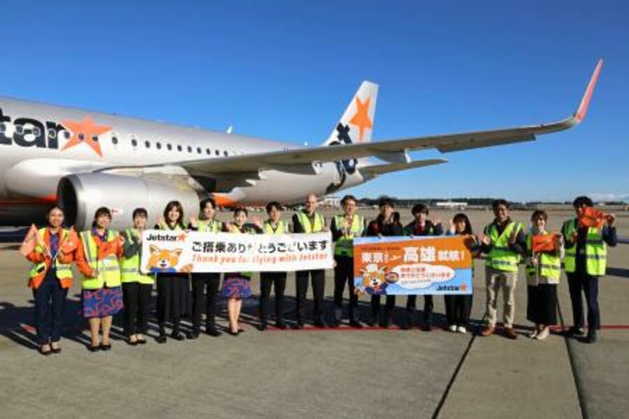 駐機場で記念写真に納まるジェットスター・ジャパンの関係者ら=18日午前、成田空港