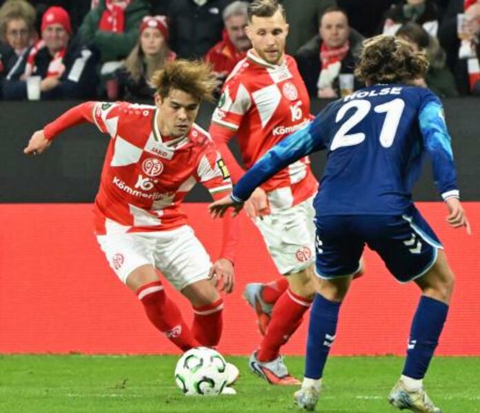 サムスンスポル戦で競り合うマインツの佐野(左)=マインツ(共同)