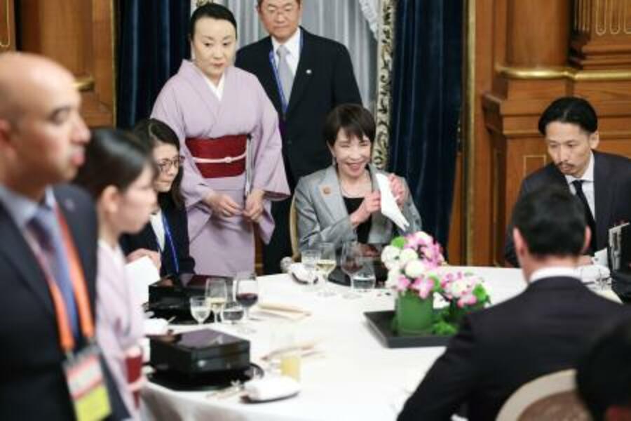 中央アジア5カ国首脳を招いて開催した夕食会で笑顔を見せる高市首相(後方右から2人目)=19日夜、東京・元赤坂の迎賓館(代表撮影)
