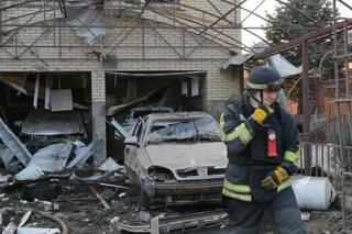 ウクライナ南部ザポリージャで、ロシア軍の攻撃で損壊した住宅の前を歩く救急隊員=19日(AP=共同)