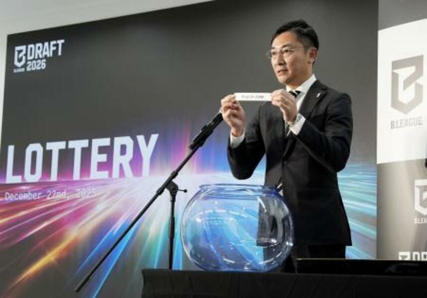 東京都内で行われたバスケットボール「Bリーグ・プレミア」の第1回新人ドラフトの指名順抽選で、くじを手にする島田慎二チェアマン=22日、東京都内