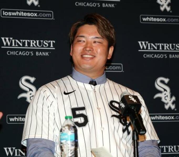 ホワイトソックスの本拠地レート・フィールドで入団記者会見に臨んだ村上宗隆=22日、シカゴ(ゲッティ=共同)