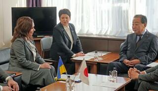 面会する立憲民主党の野田代表(右)とウクライナ最高会議議員のハリーナ・ミハイリュク氏(左)=23日午前、東京・永田町の党本部