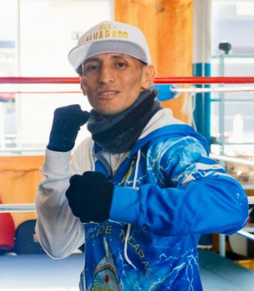 IBFフライ級世界戦に向けた練習を公開し、ポーズをとる挑戦者のフェリックス・アルバラード=23日、愛知県東海市