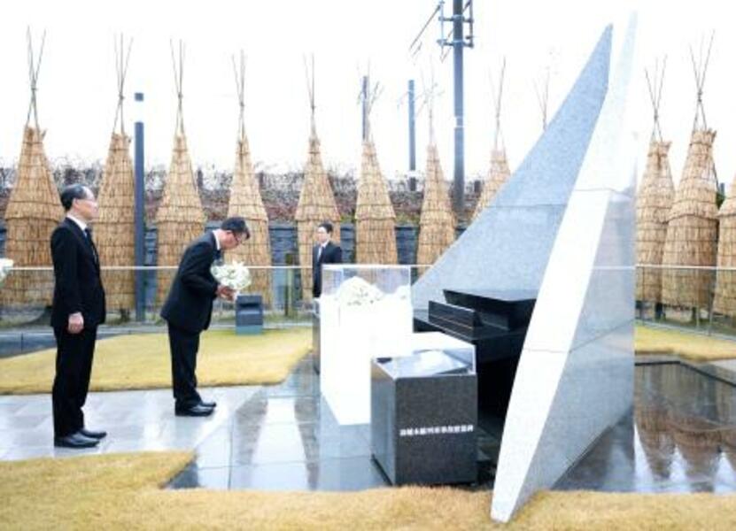 JR羽越線脱線事故から20年となり、現場近くの慰霊碑に献花するJR東日本の喜勢陽一社長(左から2人目)=25日午前、山形県庄内町