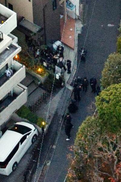 女性が刺されたマンションの現場周辺=29日午後4時27分、東京都新宿区(共同通信社ヘリから)