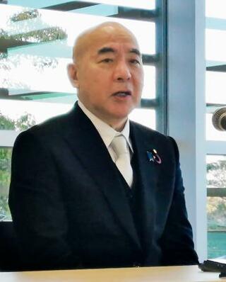 記者会見する日本保守党の百田代表=2日午後、三重県伊勢市
