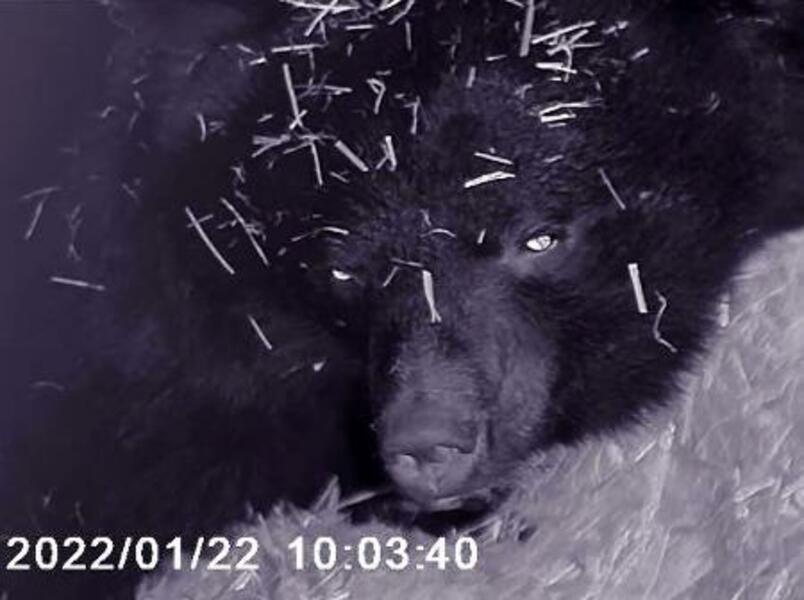 赤外線カメラに写る冬眠中の雌のクマ「リオ」=2022年(盛岡市動物公園ZOOMO提供)