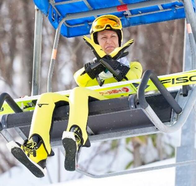 STV杯の1回目の飛躍が強風で中断し、両手でバツ印をしながらリフトで降りてくる葛西紀明。その後、中止が決まった=大倉山