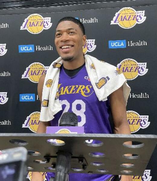 練習後、取材に応じるレーカーズの八村=ロサンゼルス近郊(共同)