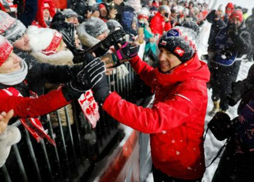 母国ポーランドでは最後となるW杯で、観客とタッチを交わすカミル・ストッフ=ザコパネ(共同)