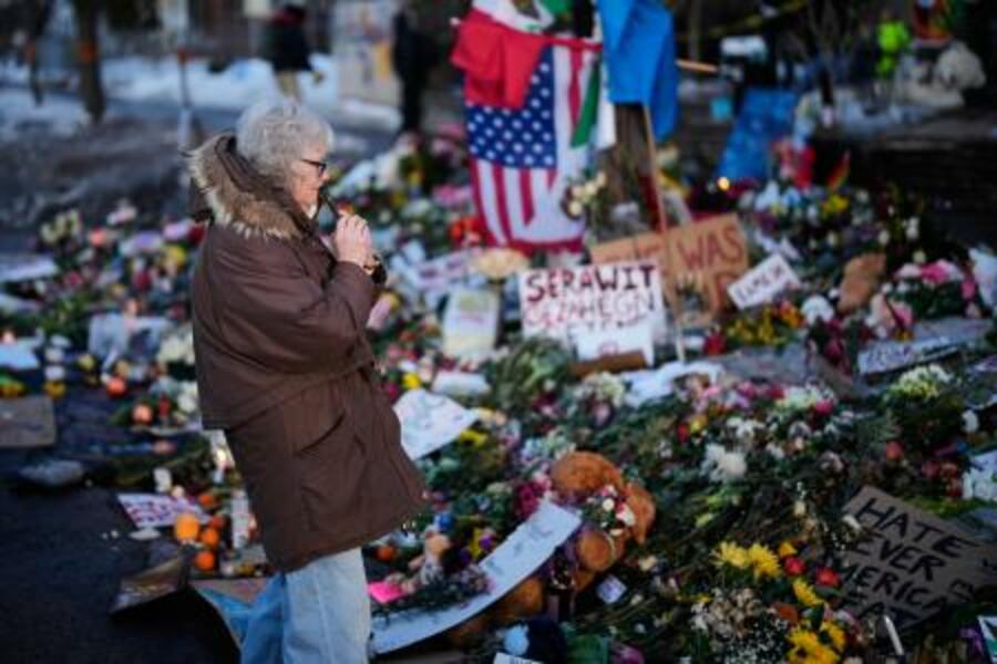 米移民・税関捜査局職員に撃たれて死亡した米国人女性グッドさんを悼む人と供え物=12日、ミネソタ州ミネアポリス(AP=共同)