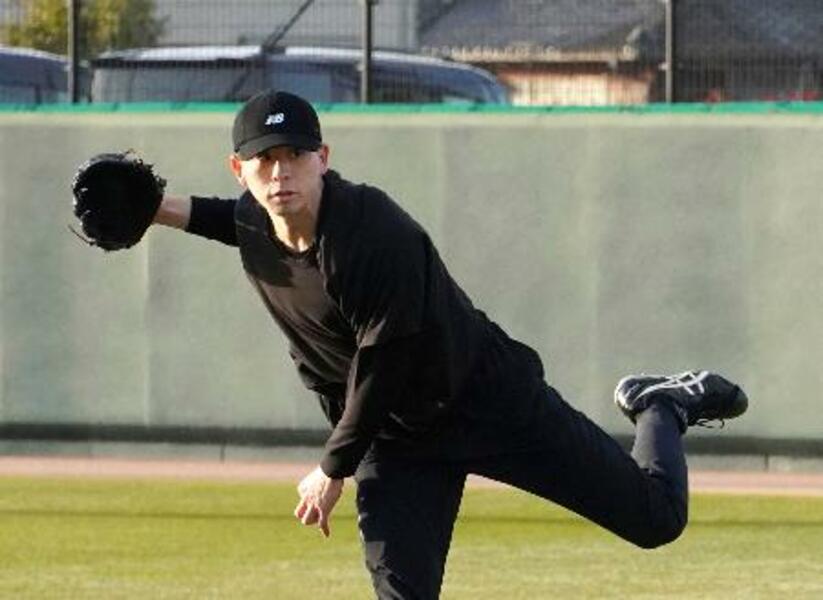 キャッチボールするソフトバンク・大関=福岡県筑後市