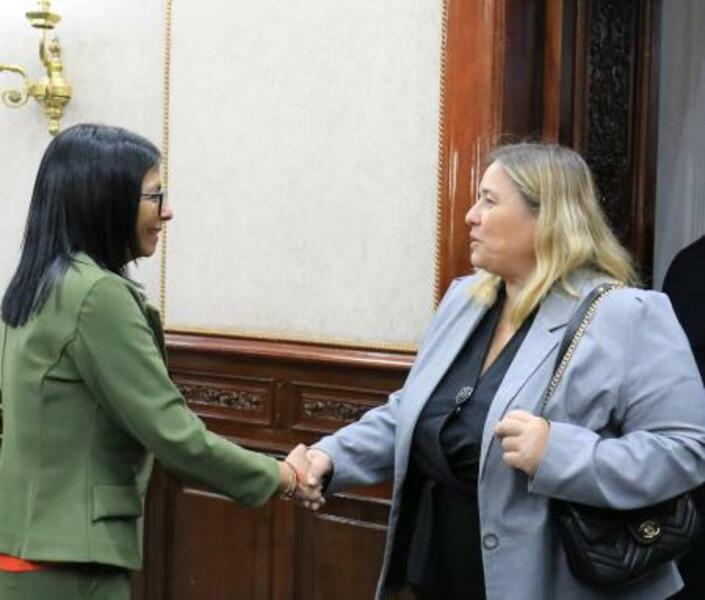 握手を交わすベネズエラのロドリゲス暫定大統領(左)と欧州連合(EU)の代表=12日、カラカス(ロイター=共同)