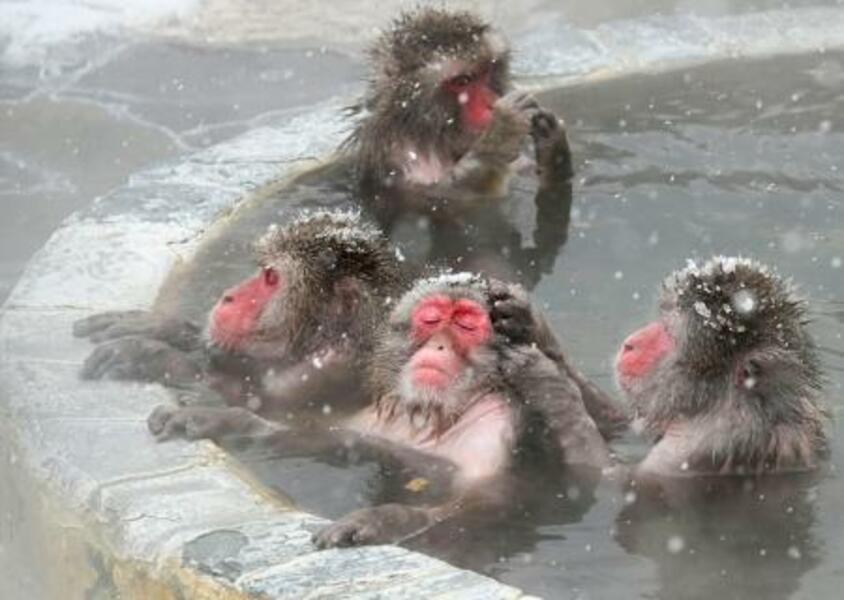 北海道・函館市熱帯植物園で温泉に漬かるニホンザル=14日午前