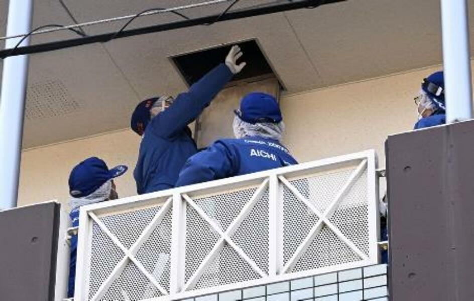 室内で焼けた女性の遺体が見つかった集合住宅を調べる捜査員=18日、愛知県豊田市東新町