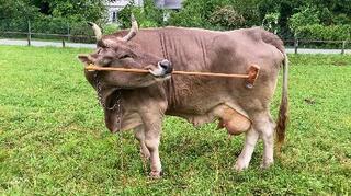 ブラシを使って自分の体をかく仕草をするウシ「ベロニカ」(研究チーム提供)