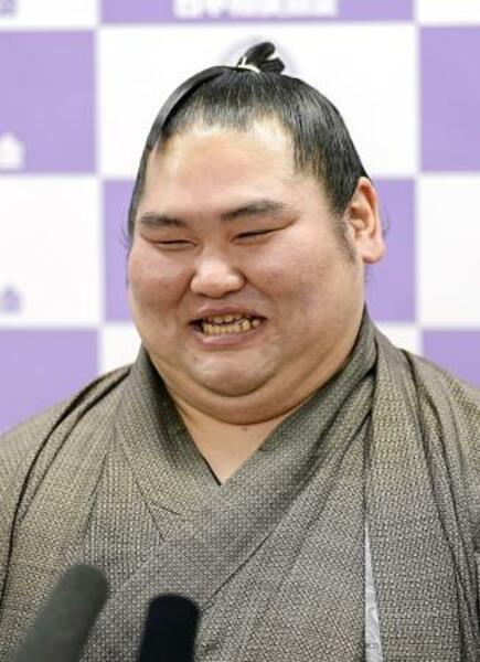 現役引退の記者会見で笑顔を見せる元幕内の大奄美=20日、両国国技館