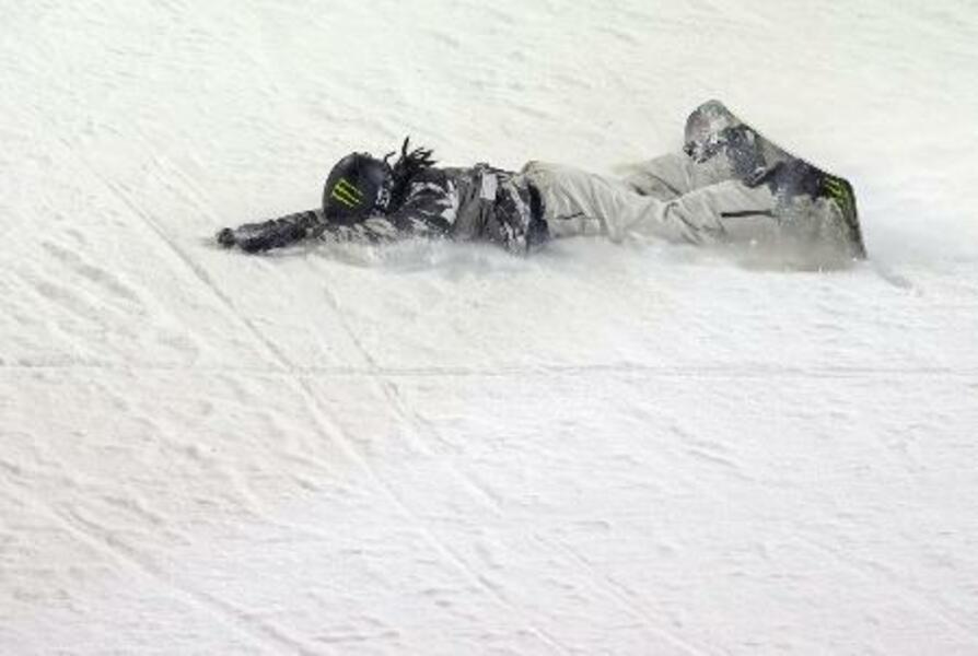 ハーフパイプ第5戦、男子決勝で転倒した平野歩夢=2026年1月17日、ラークス(共同)