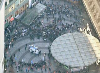 衆院が解散し、政党の街頭演説に集まった人たち。事実上の選挙戦が始まった=23日午後3時3分、東京都千代田区(共同通信社ヘリから)