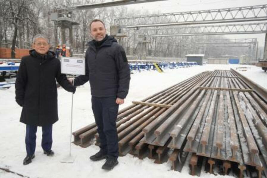 供与された日本製レールの前に立つ国営ウクライナ鉄道のオレクサンドル・ペルツォフスキー総裁(右)と中込正志駐ウクライナ大使=22日、ウクライナ・キーウ(共同)