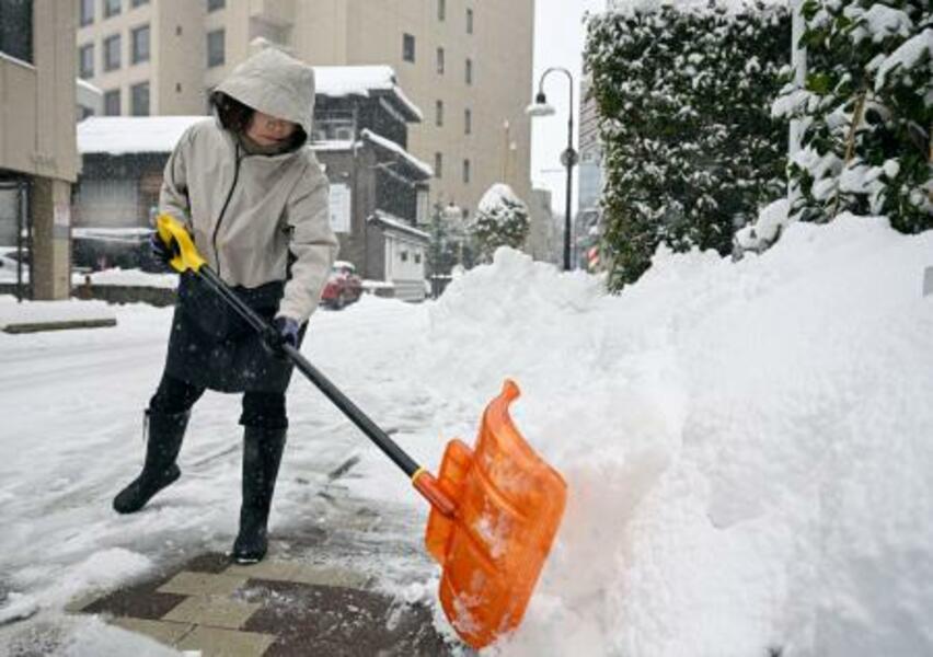 雪かきをする人=23日午前、金沢市