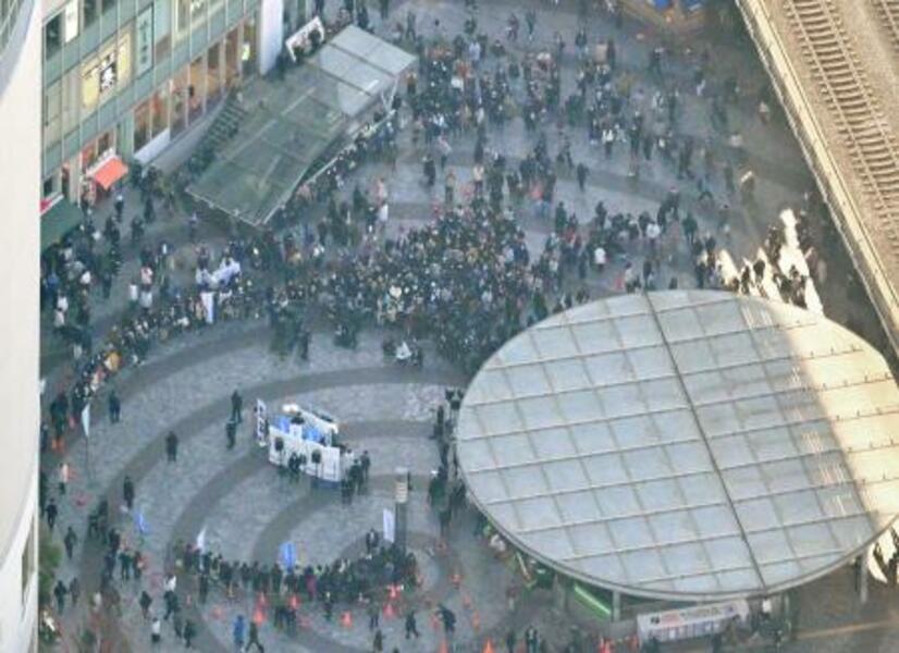 衆院が解散し、政党の街頭演説に集まった人たち。事実上の選挙戦が始まった=23日午後3時3分、東京都千代田区(共同通信社ヘリから)