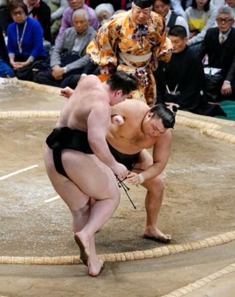 霧島(右)が寄り切りで獅司を破る=両国国技館